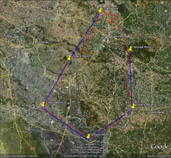 En bleu vous l’aurez deviné, le trajet thérorique.