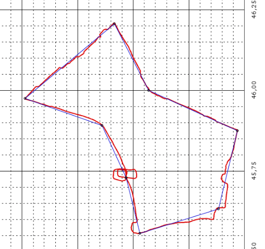 Voici le tracé; en bleu vous l’aurez compris le tracé théorique, en rouge le tracé réel !