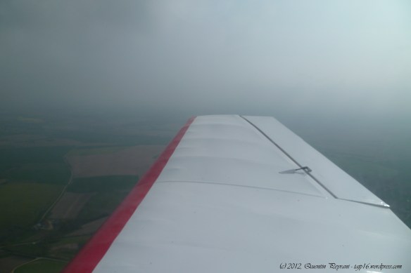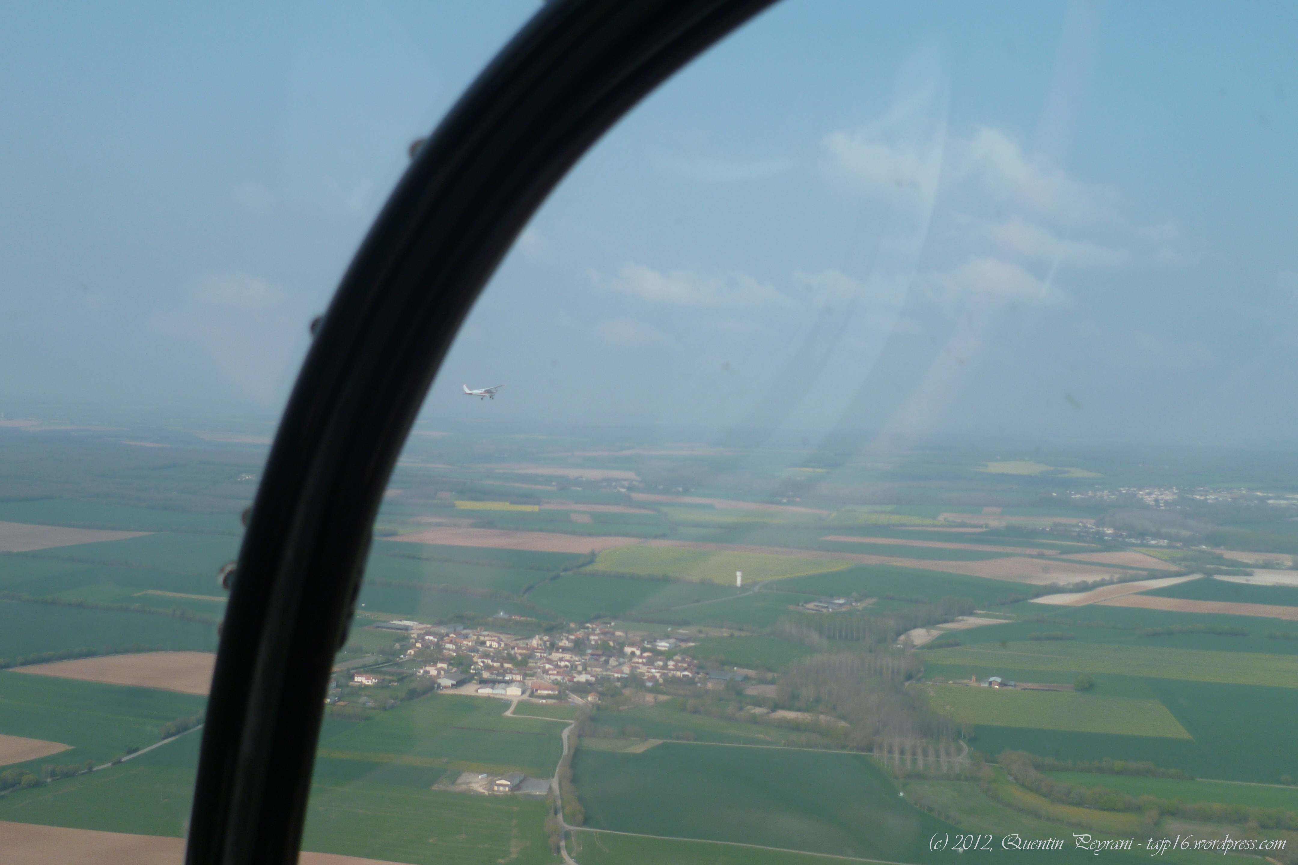 Je finis par le trouver, et je me mets derrière lui. Il avait ralenti pour que je puisse le rattraper. J’étais au maximum du Jodel, je mis bien un gros tiers du trajet pour le rejoindre. Lors de cette étape, j’avais trouvé une astuce pour éviter de le perdre de vue. Je volais un peu plus haut que lui afin de repérer son appareil grâce aux reflets du soleil sur ses ailes :D. Sinon, je ne voyais qu’un point noir sur fond gris, autant dire que je le perdais tout de suite ^^.