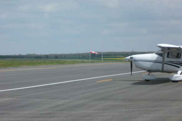 On est au printemps, mais il fait froid, un bon vent du nord. En plus, il est travers piste. Le décollage ainsi que le roulage promet d’être fun :p.