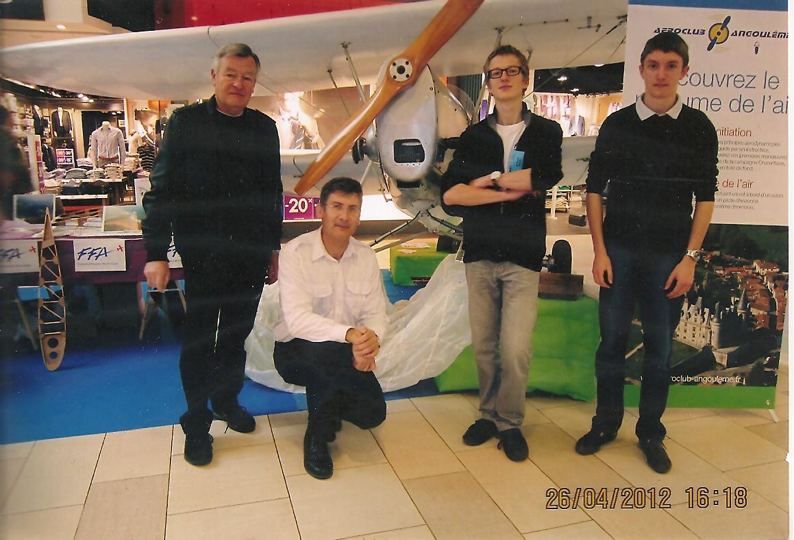 ET l’aéroclub d’Angoulême y tenait naturellement présent un stand; en face du magasin Brice à une interception d’allées, jusqu’à Vendredi soir. Notre stand était dominé par un superbe Pou-Du-Ciel construit (enfin; fini) en 1995 par Jean-Louis G. Il est basé à Montendre situé entre Bordeaux et Cognac.