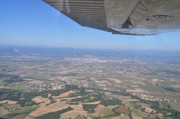 Après de bonne minutes de vol sur un relief et des vallées, j’eus quelques minutes de stress. A ce moment là, j’étais sortie de la zone de Clermont info. Ils ne me recevaient plus depuis un petit moment, ce fut un avion qui a servi de relais. J’étais passé avec Lyon Info et je n’arrivais plus à confirmer ma position. Néanmoins, coup de stress, mais je n’avais pas perdu la tête. J’avais tout de suite envisagé la chose, et mon plan était très simple. Rejoindre le Rhône qui ne tarderait pas à arriver dans mon champ de vision (et j’eus raison, quelques minute plus tard, il était en vue), et cheminer jusqu’à un point de repère. Je n’eus même pas à le mettre à exécution. Je sors du relief sur mon trait. En effet, le point où je devais traverser le Rhône était un village. Et d’après la trajectoire que j’avais, j’allais traverser le Rhône à ce niveau là. Après quelques échanges avec Lyon Info, je pose à destination. Ca fait 2h50 que je vole. En partie du à mon crochet et à ma vitesse de 160 km/h, en effet, j’ai décidé de réduire ma vitesse de 20km/h afin d’être moins secoué par les turbulences ;).