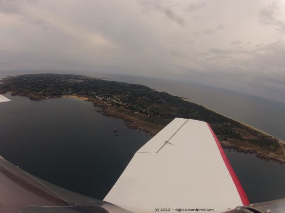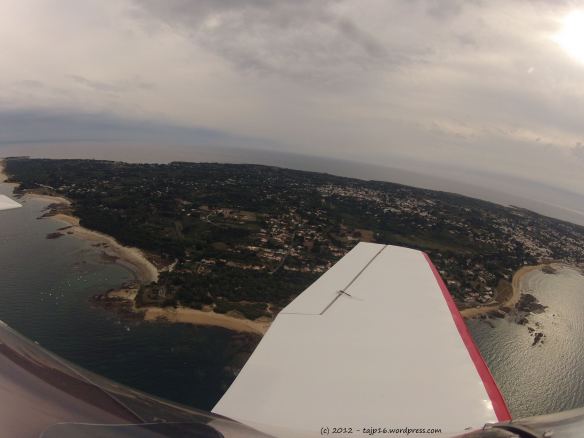 Reprenons nos moutons et revenons à nos assiettes. Après quelques coup de fil qui incombent au commandant de bord, on fait le plein des deux réservoir du D113. Je prends la météo et on décolle. L’aller se fait sans encombre. Je ne suis ici qu’au cap et à la montre. Pour le cap, pas de turbulence, le compas suffit. Néanmoins, j’ai tout de même mis le conservateur de cap du GPS (aucune programmation, juste la boussole) par sécurité. On a la clairance pour transiter à 2000 ft dans la zone de Cognac. On passe La Rochelle, les Sables D’Olonne et on arrive enfin pour faire la traversée…