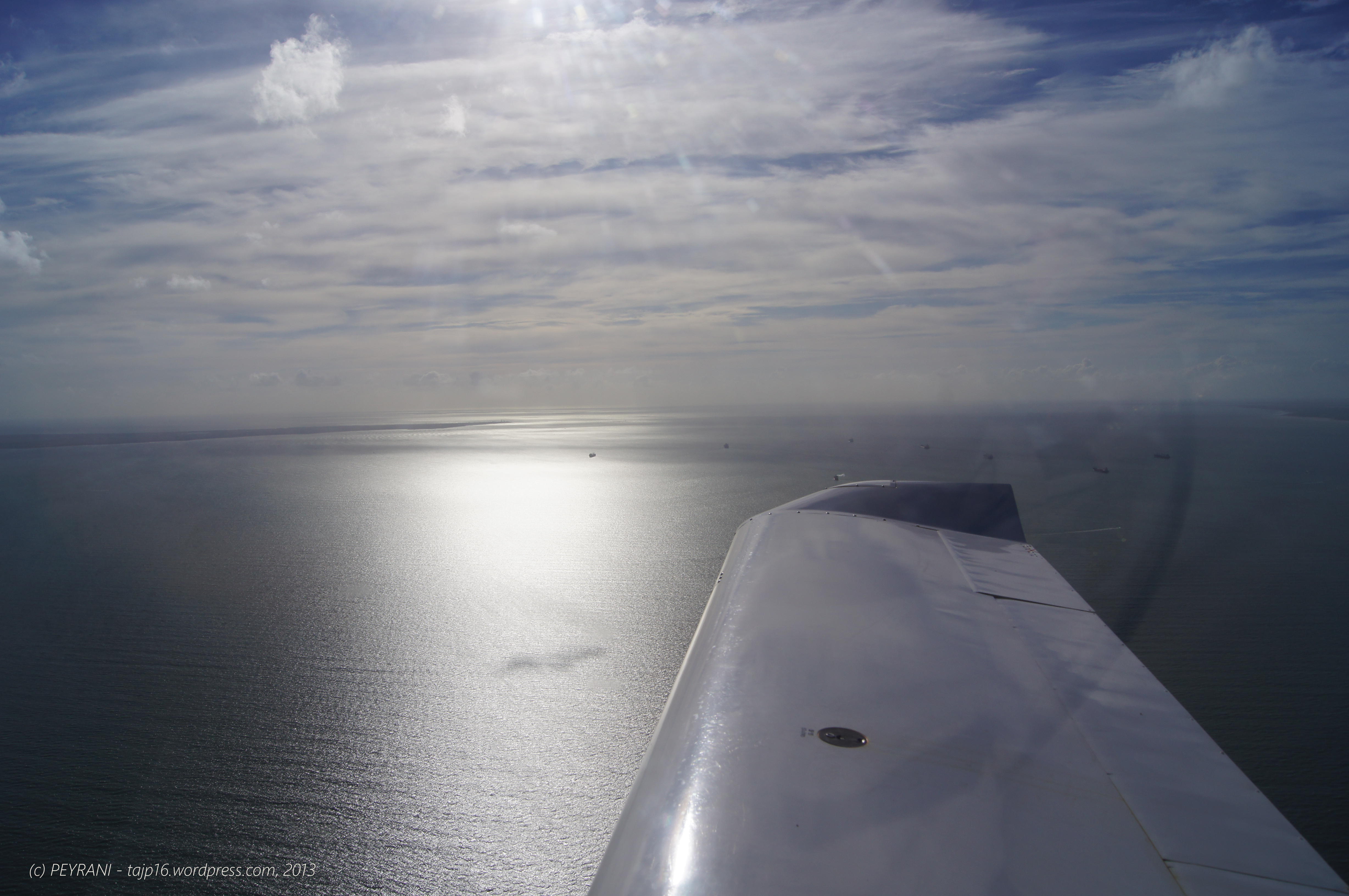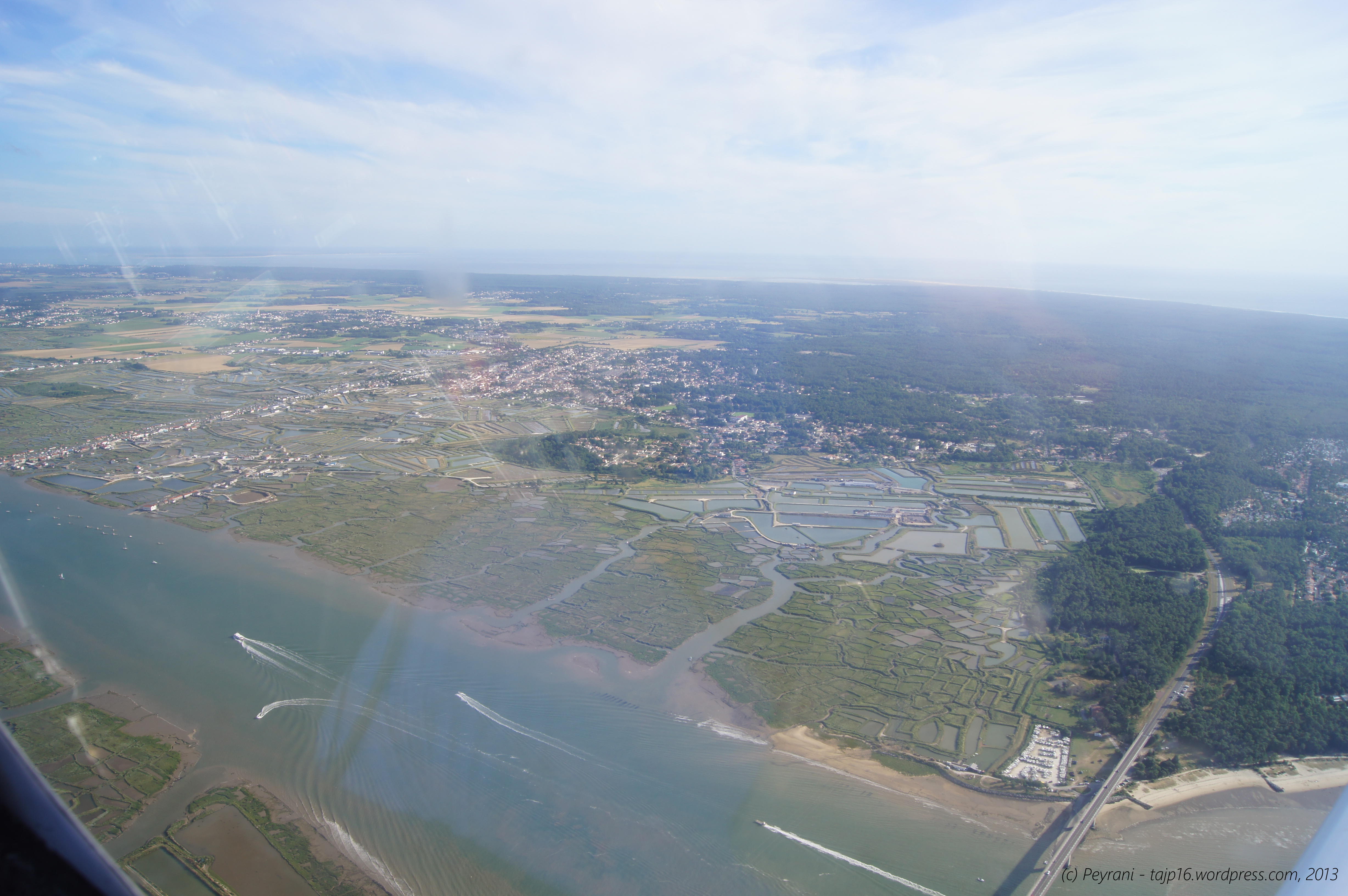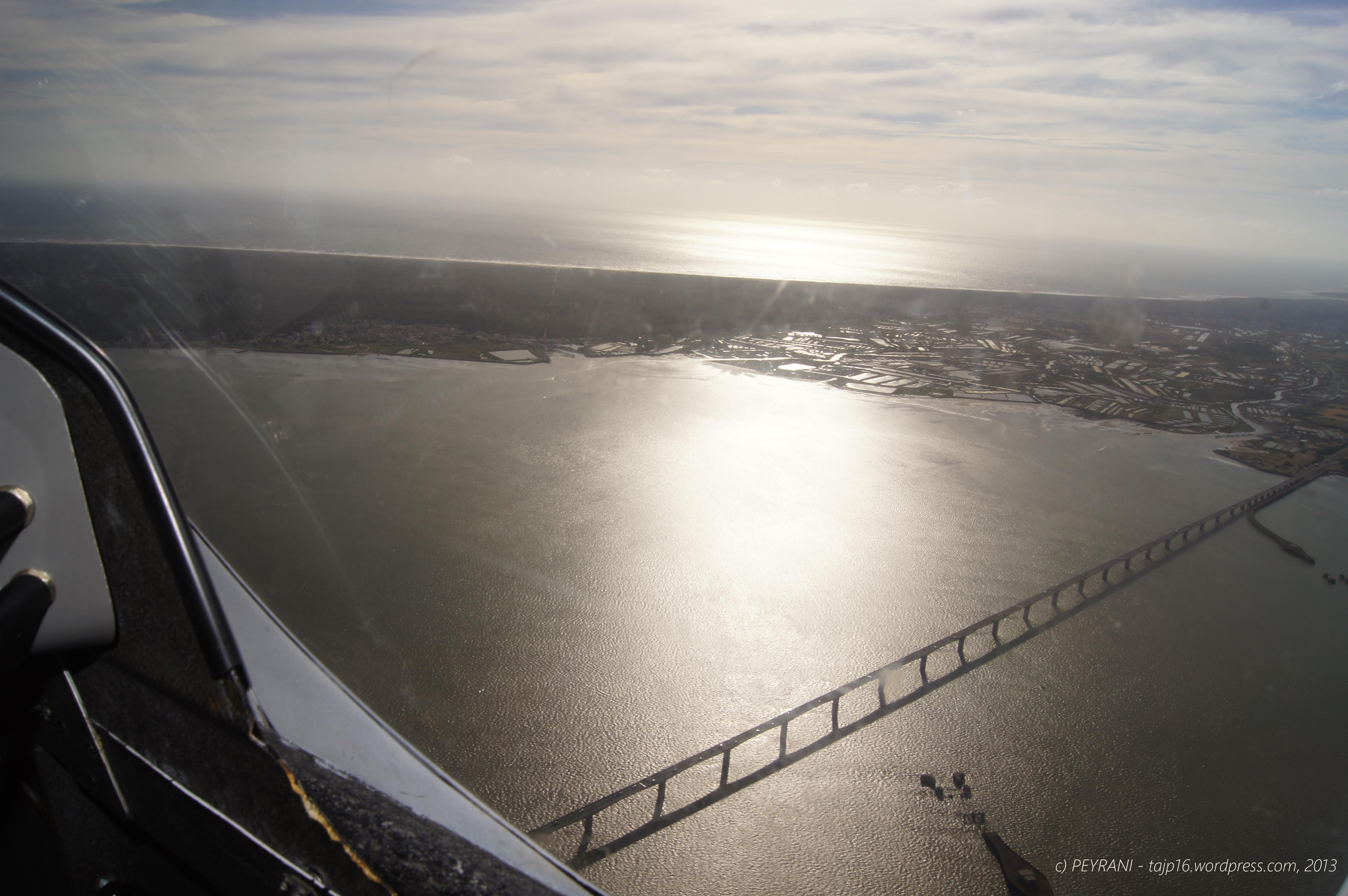Nous décollons et bénéficions ainsi d’une belle lumière rasante. En face de nous: l’Ile de Ré et son pont.
