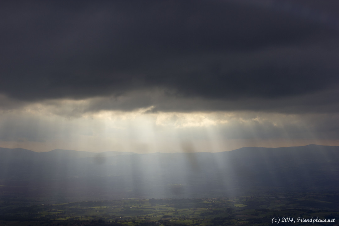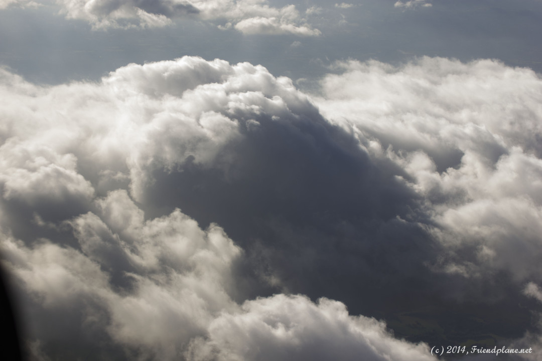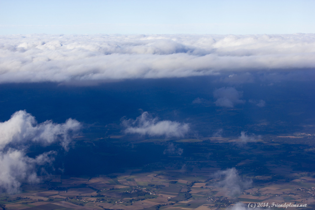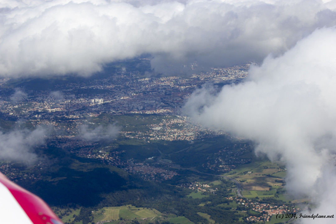 Zone de Lyon en vu. Comme à l’aller, nous sommes obligés de suivre les instructions du contrôleur. Il nous donne une altitude à conserver pour traverser la zone: quelques AIRBUS en train d’atterrir :). Nous la traversons à 2500ft. Avec la nébulosité et les rayons du soleil, cette altitude nous offre un fabuleux point de vu avec de très jolies contrastes.