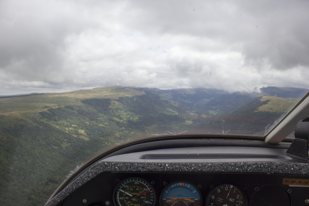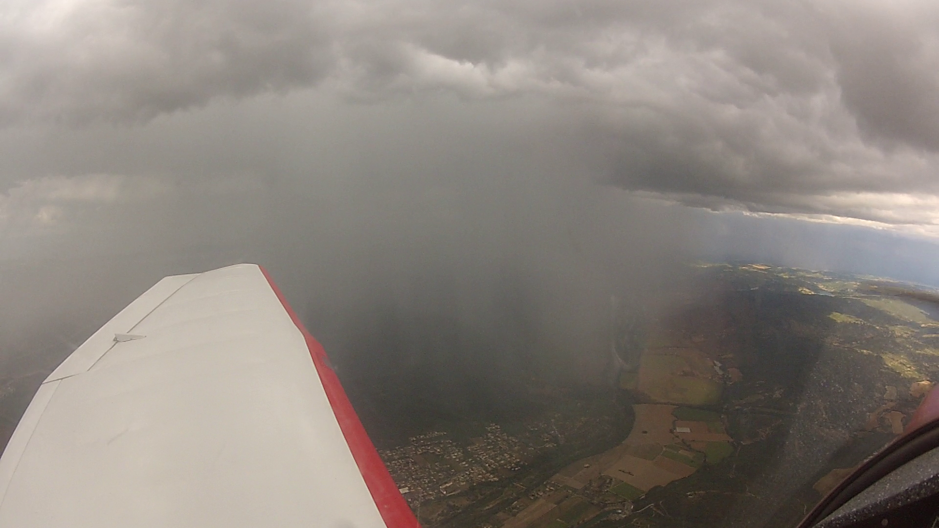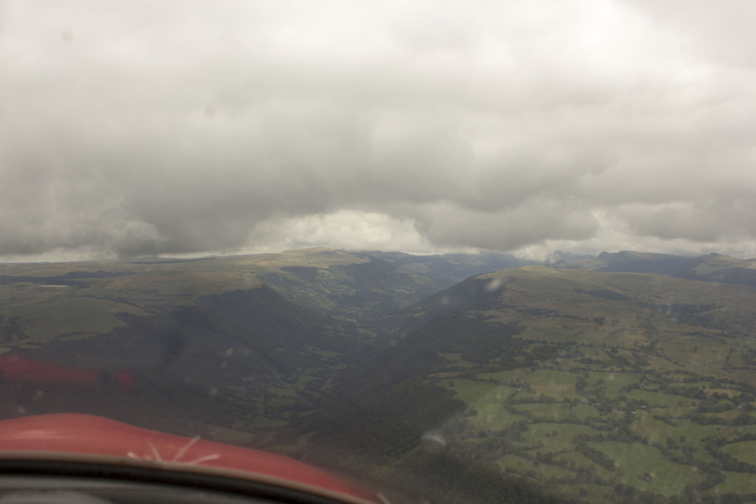 J’ai choisi la seconde alternative pour profiter d’une nouvelle vue: 150m au dessus du sol, le relief à notre hauteur à notre travers, coiffé de son chapeau nuageux… Belle perspective :D. J’informe le contrôle de mon intention :).